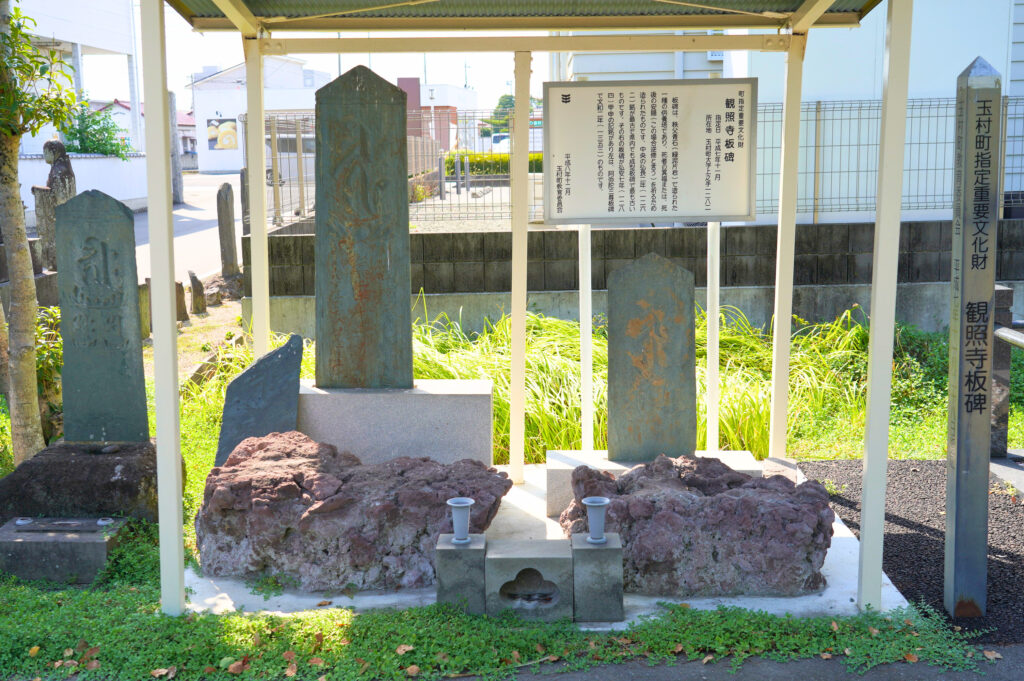 観照寺には、町の重要文化財に指定されている阿弥陀板碑が3基あります。いずれも秩父青石(緑泥片岩)でつくられ、死者の冥福や死後の安穏を祈るために建立されたものです。13世紀から14世紀にかけての作で、群馬県内でも最古級の板碑として大変貴重です。