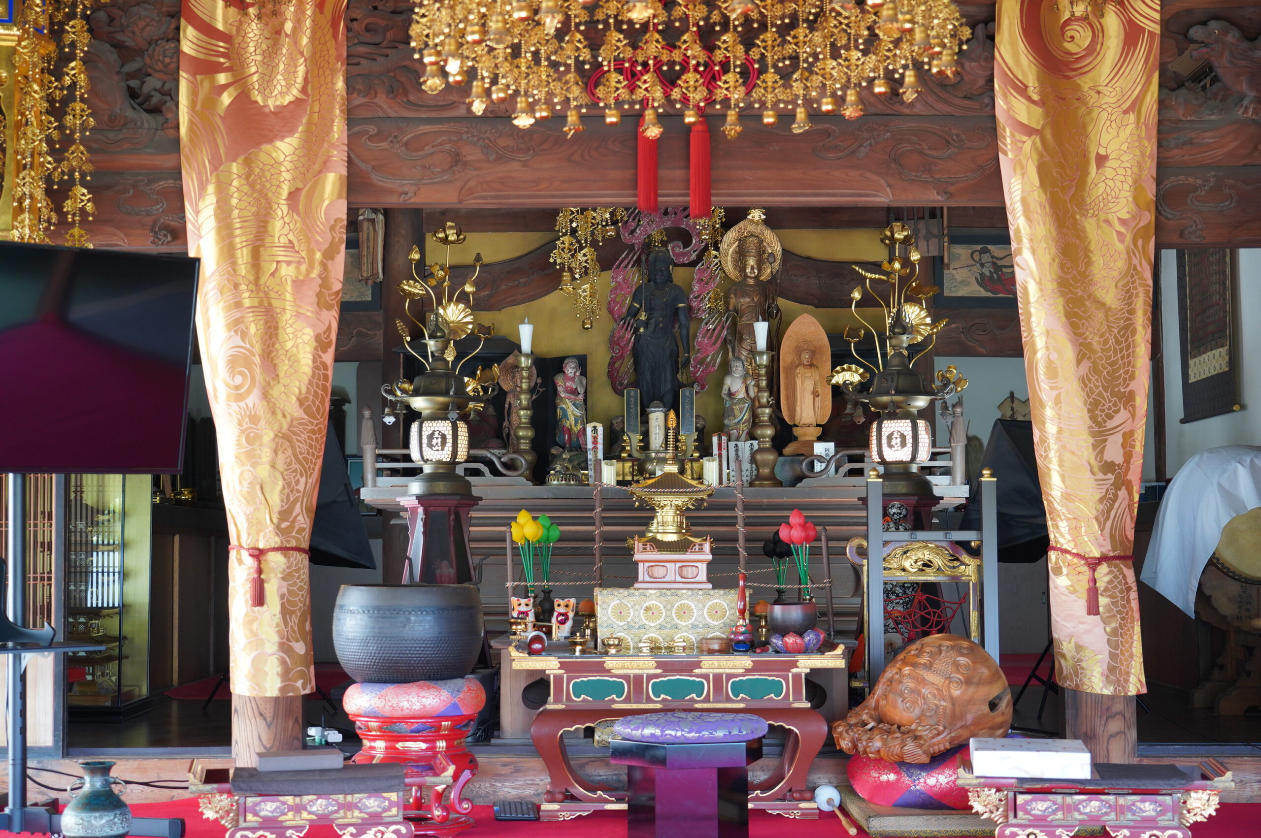 本尊は不動明王。堂内には、龍や唐獅子、羅漢の精緻な彫刻、地元玉村の絵師・玉済による天井絵が施されており、訪れる方を静かに包み込みます。
